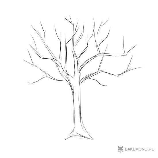 Сделайте набросок ствола тонкими линиями. Ствол должен быть увеличен по ширене на уровне корней и там где начинаются ветки. А ветки должны быть раскиданы по полукругу.