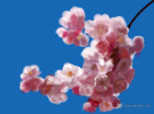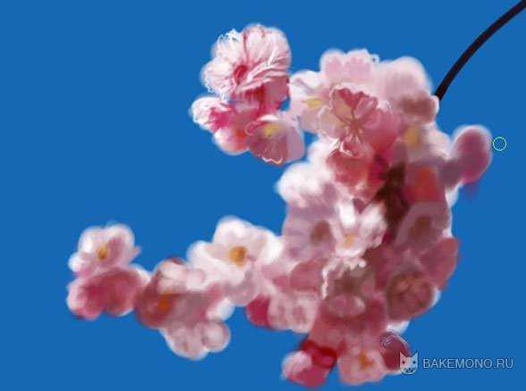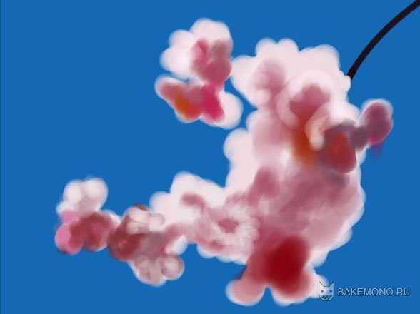 Продолжайте добавлять текстуру для лепестков цветов сакуры. Используйте белый цвет для цветов, на которые падает свет. А розовый цвет, для цветов, которые в тени.