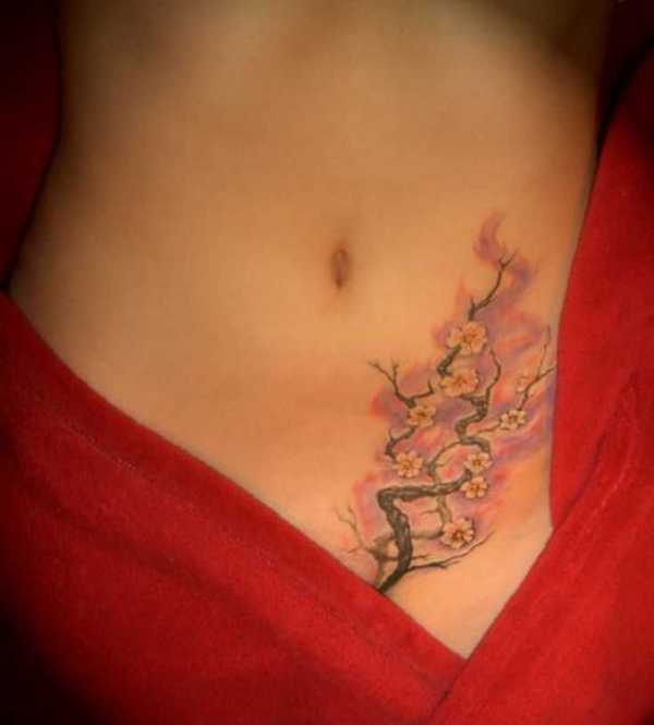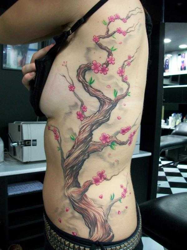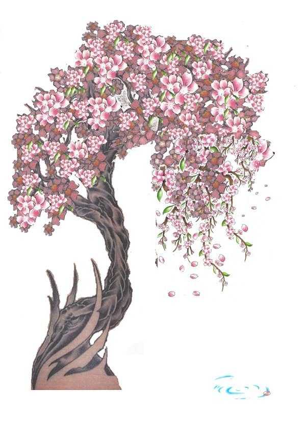 В тату-искусстве широким спросом пользуется не только ветка сакуры, либо ее цветы, но и изображение самого дерева. Японская вишня является олицетворением невинности, чистоты и юности. Но помимо этого, так же оно может говорить о несправедливости и страданиях.