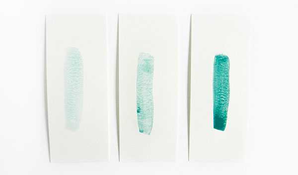 Картинка слева показывает как выглядит мазок, когда много воды и немного краски. На иллюстрации посередине более равное соотношение воды и краски. На правой картинке больше краски, чем воды.
