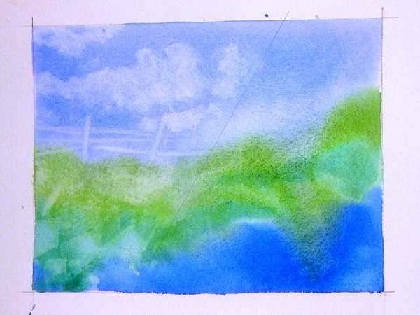 Мы снова будем рисовать ландшафт. Начнем, конечно же, с неба. Используя данную технику, проще рисовать сначала фон, переходя потом к объектам первого плана.
