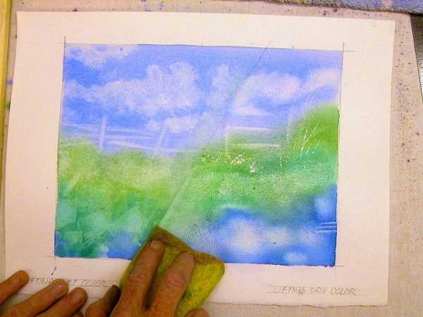 Эта техника потребует несколько губок. Она подходит для изображения облаков, мягкого света. А еще ею можно контролировать поведение красок.