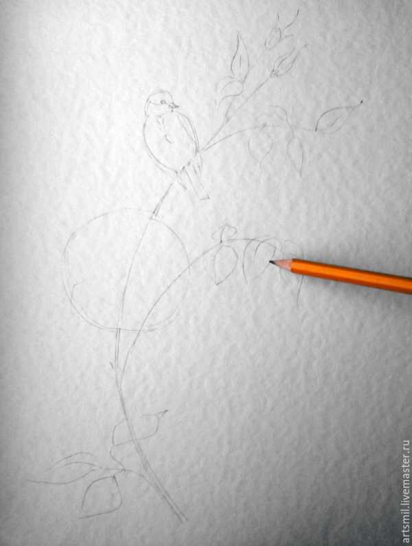 Опытные художники рисуют сразу акварелью. Для вашего удобства, намечаем веточку карандашом. Стараемся не сильно давить на карандаш, чтобы не было вмятостей и карандашный рисунок не было сильно видно, т.к. акварель прозрачная и карандашный рисунок будет проступать.