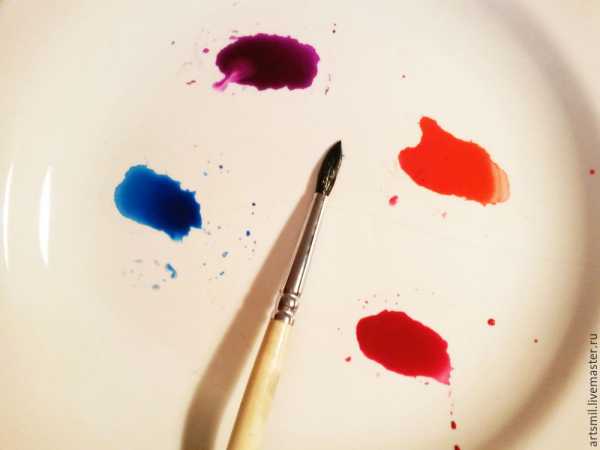 Разводим краски нужных цветов. Для того, чтобы вас не запутать, начнем с цветка. Цветок будет розовых оттенков. В качестве палитры люблю использовать тарелочку. Добавляем четыре цвета, красный, малиновый, фиолетовый и синий. Холодные оттенки, синий и фиолетовый будем использовать для создания теней.