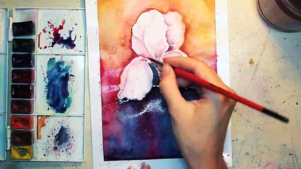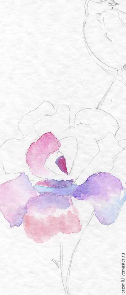 Начнем с первого лепестка, проводим мокрой кистью по всему лепестку, затем около основания наносим фиолетовую краску, а по краям красную. Акварель, в отличие от масла, полупрозрачная, постарайтесь использовать это свойство. Чтобы лепестки получались воздушными наносите краску легкими движениями, небольшими мазками, избегайте густого плотного красочного слоя. Поскольку бумага предварительно смочена водой, краска красиво растекается. Сложно объяснить как должна растекаться краска, поэкспериментируйте, это нужно почувствовать.