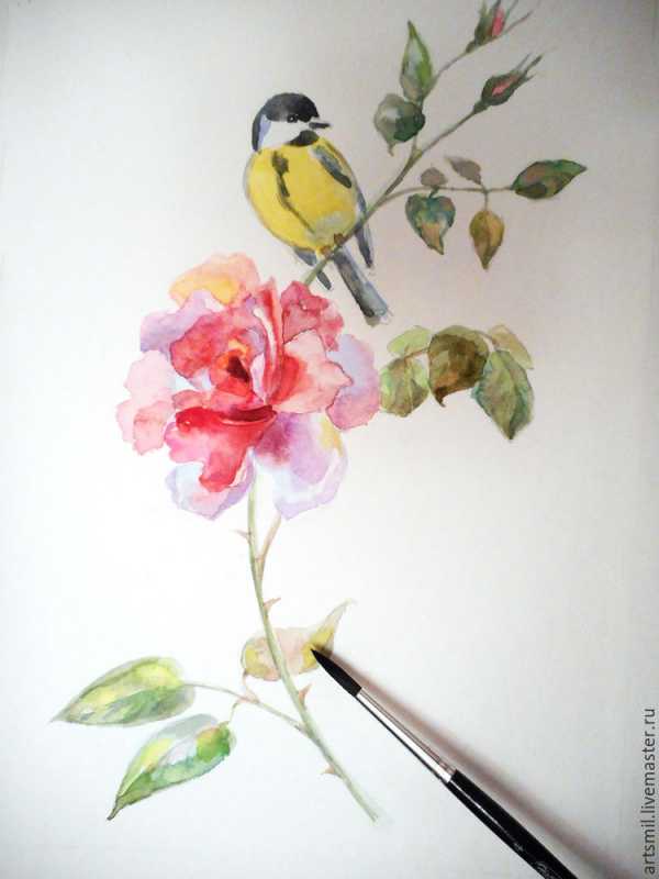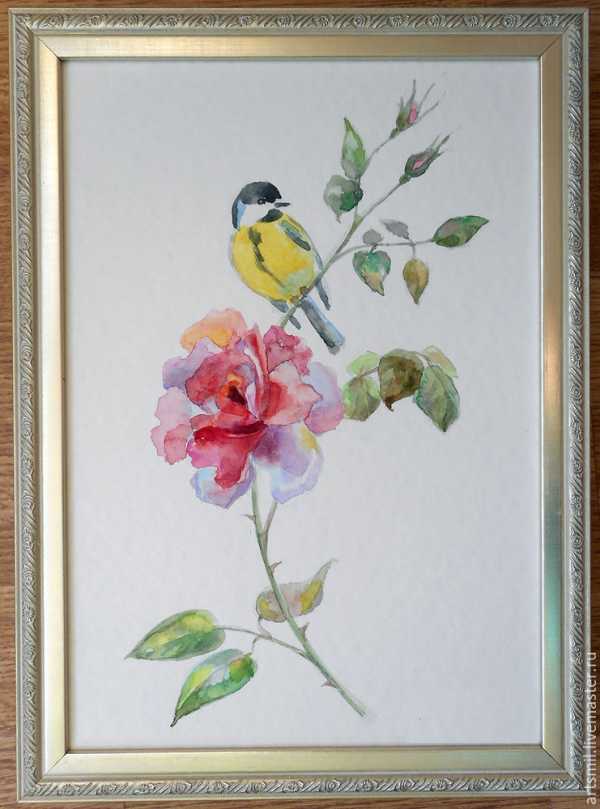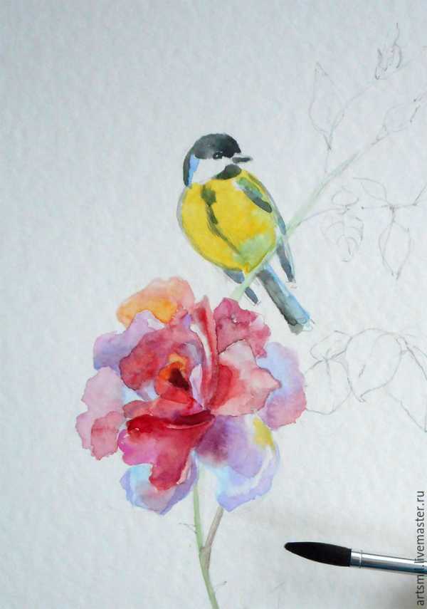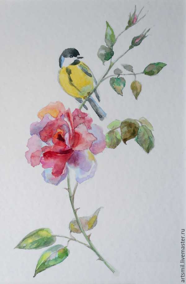 В качестве примера предлагаю нарисовать веточку розы и синичку. Маленькие птички очень любят использовать розы в качестве укрепленной крепости, здесь, среди шипов, они чувствуют себя в безопасности.