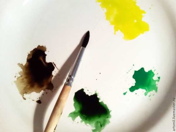 Разводим на тарелочке четыре цвета: зеленый, темно зеленый, темно коричневый и желтый.