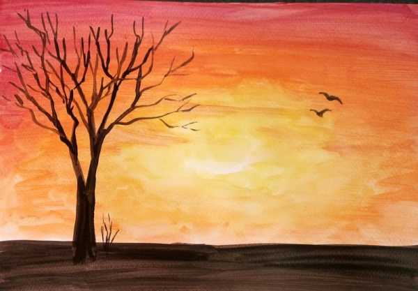 Дайте рисунку подсохнуть и добавьте некоторые элементы: отражение дерева в озере и поток воды.