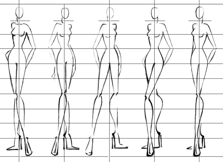 Их длина составляет не менее 4-х голов. Они состоят из бёдер – начиная от низа тазового квадрата до колена, и икр – от колен до щиколоток. Следуя манере дизайнеров, можно увеличить рост модели за счёт удлинения ног. Верхняя часть бедра – одной ширины с головой. К колену – сужайте до трети от самой широкой части бедра. Затем сужайте дальше к щиколоткам, которые должны быть равны четвертой части ширины головы.