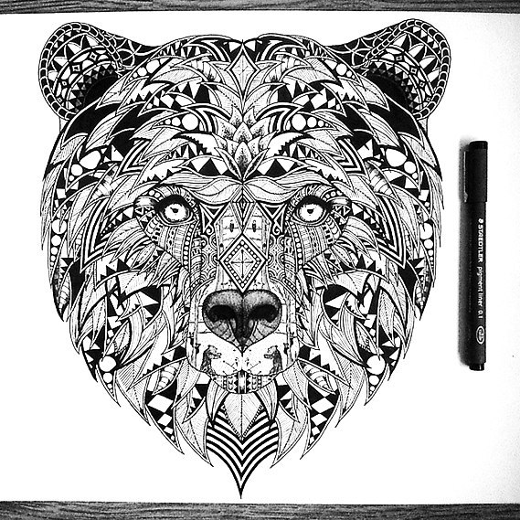 Контур медведя Женственным изображением считается контур медведя. Вокруг него чаще всего располагаются цветы. Такой мишка выполняется в графическом черно-белом стиле. Четкие линии и контуры сейчас на пике моды. Также зверя часто делят на две части, одну из них изображают графическими линиями, а другую — в виде цветков.