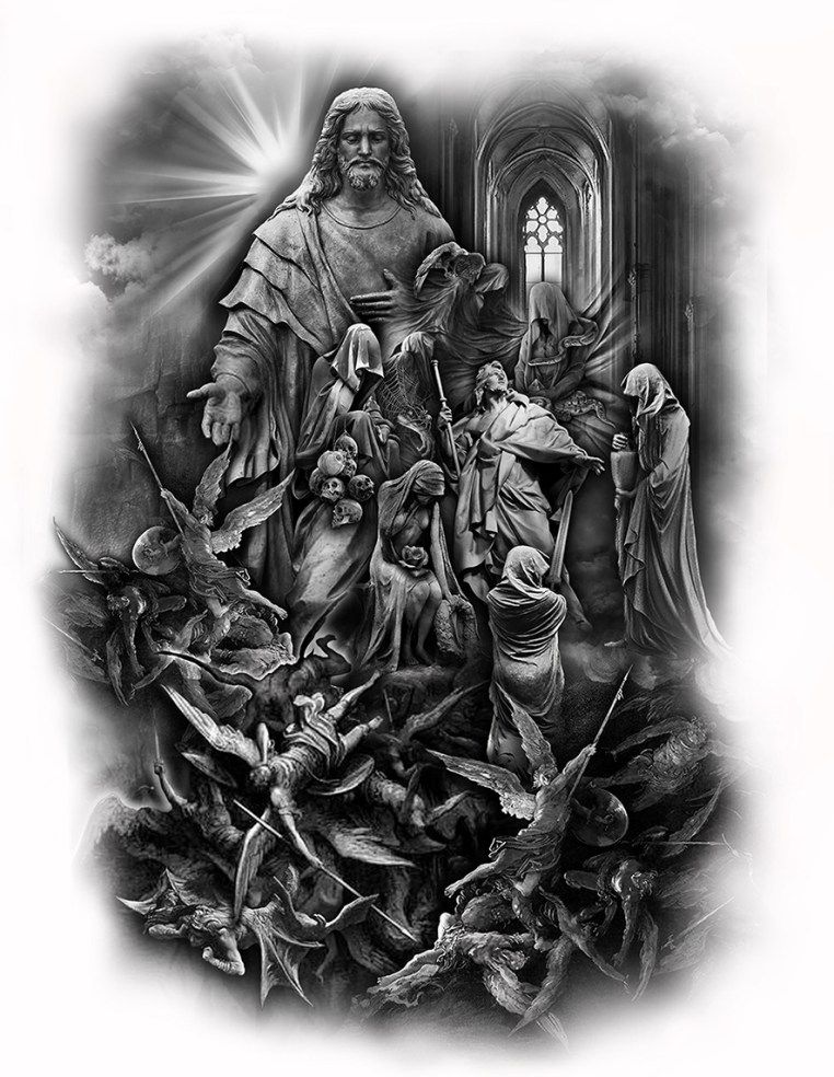 Данное направление можно приравнять к искусству, так как для выполнения рисунков на божественную тематику нужно в совершенстве обладать техникой и мастерством нанесения татуировок. Иногда одно такое творение делается несколько дней или даже недель, особенно если накладывается изображение лика святого.
