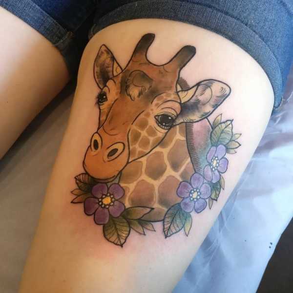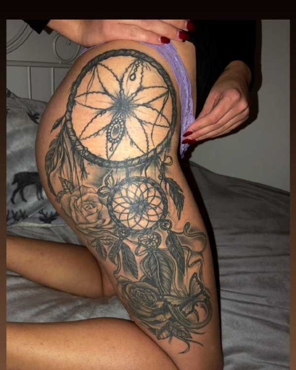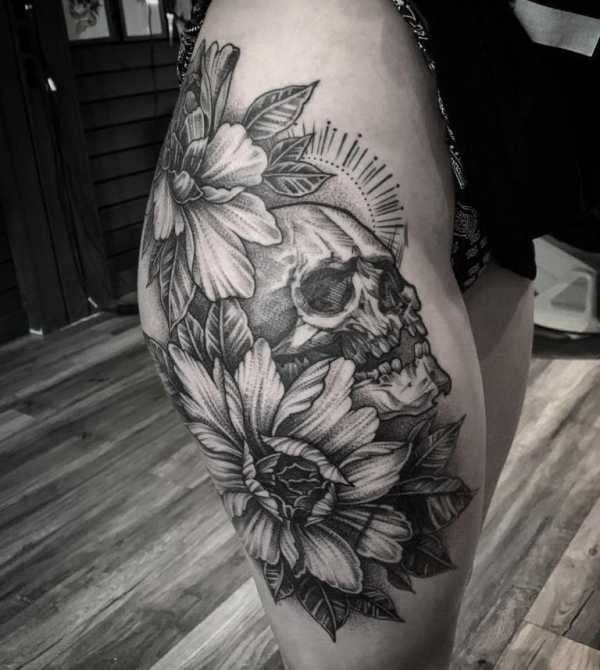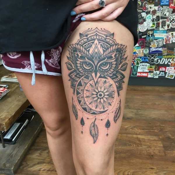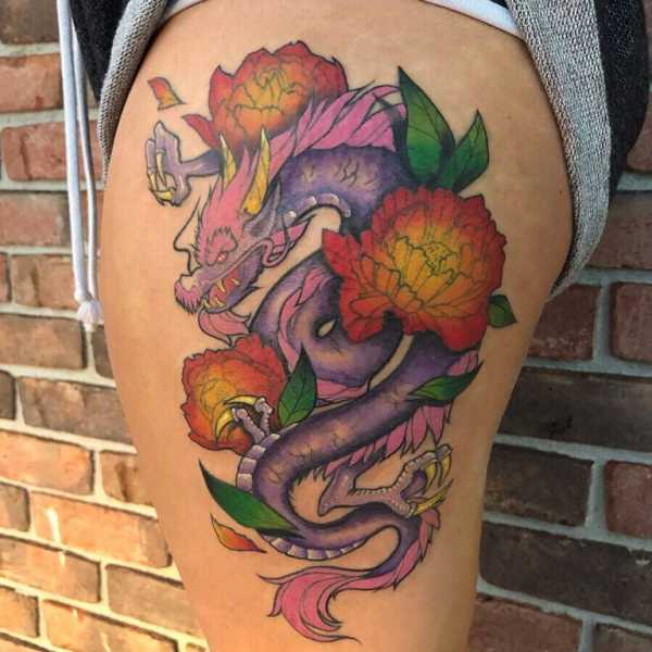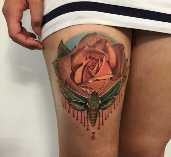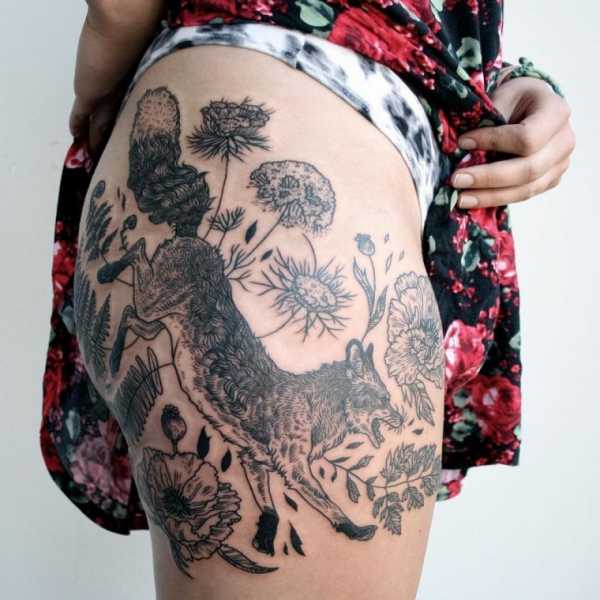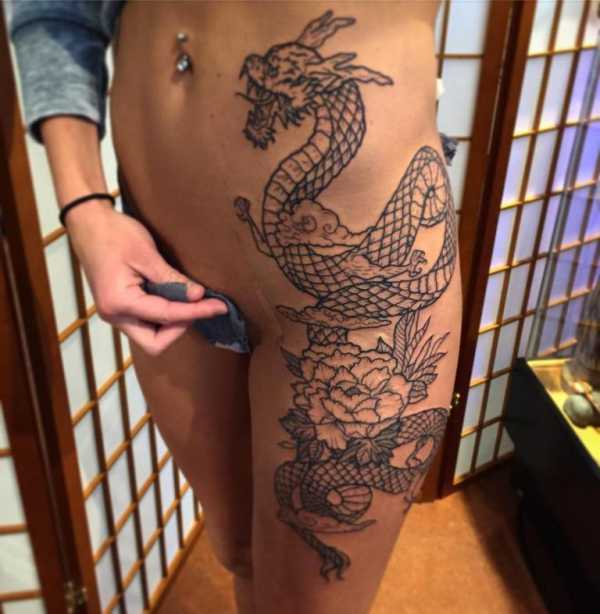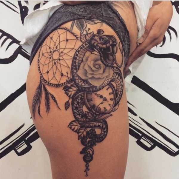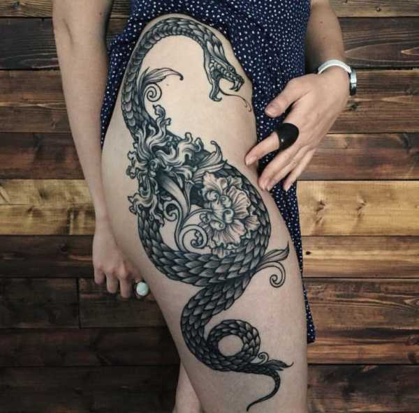Лучше всего на бедре смотрятся цветы, драконы, ловцы снов, змеи, черепа, изображения животных и пр. Ниже, на представленных фото вы можете сами в этом убедиться.