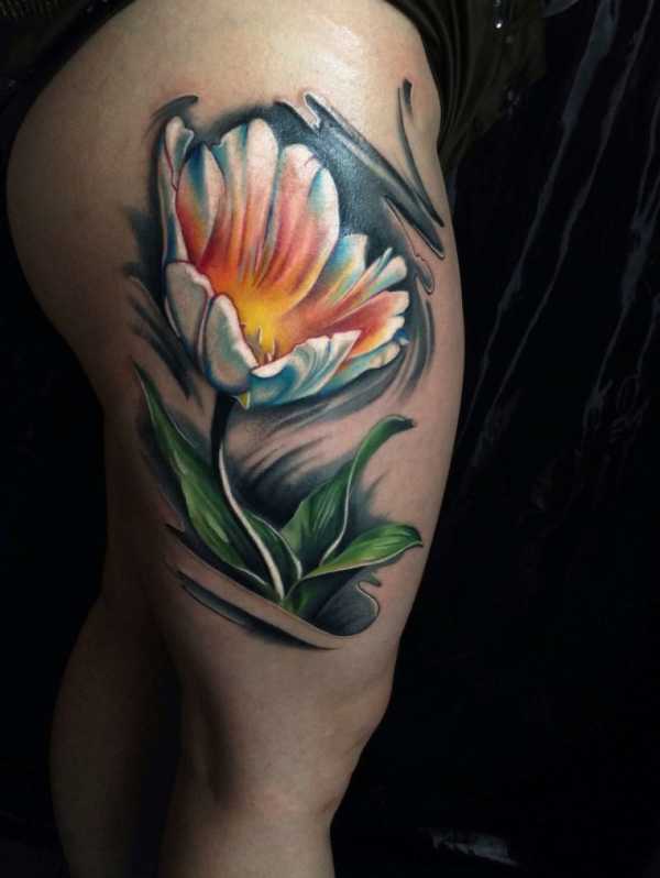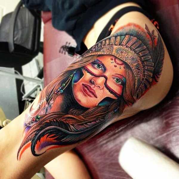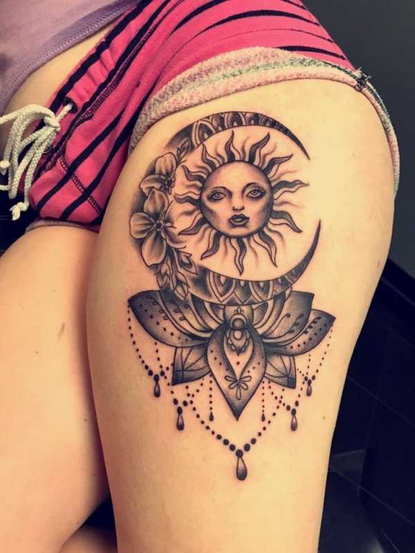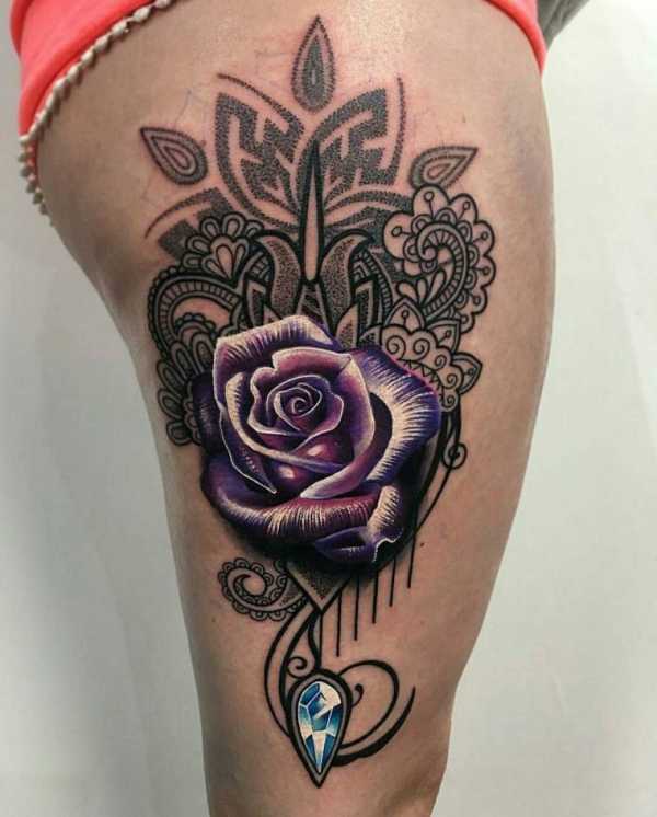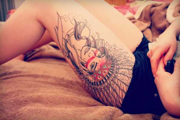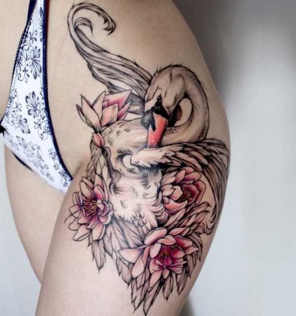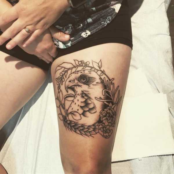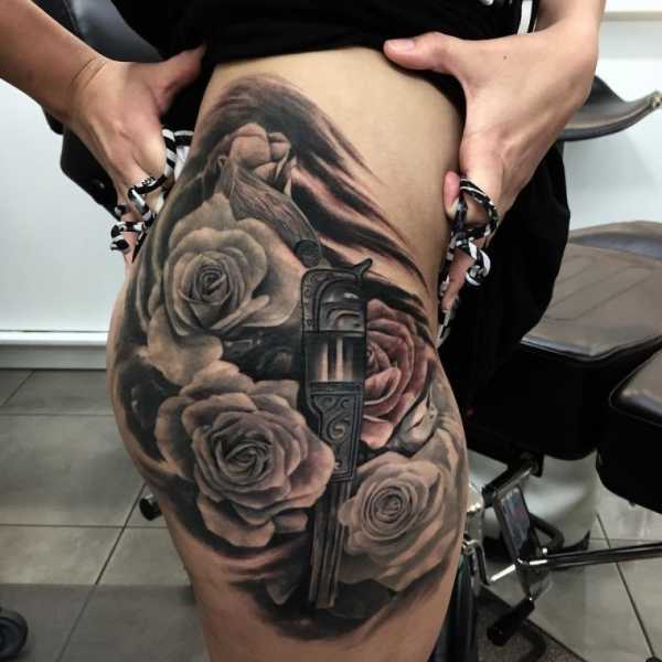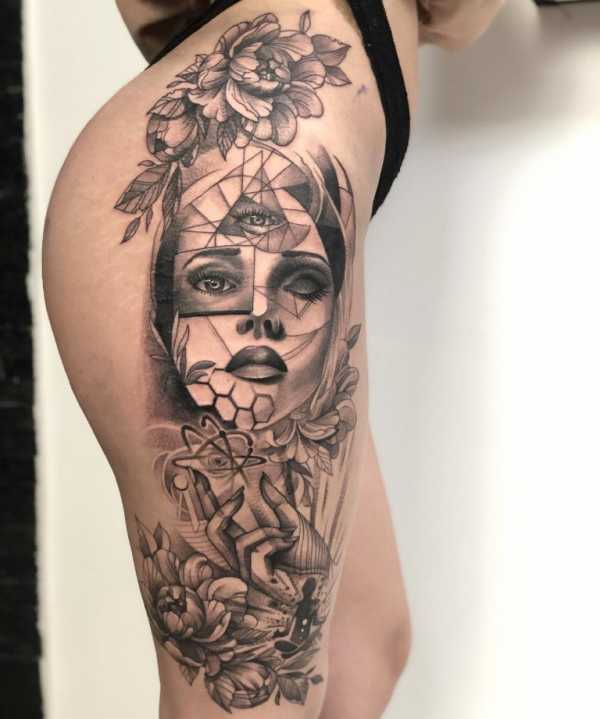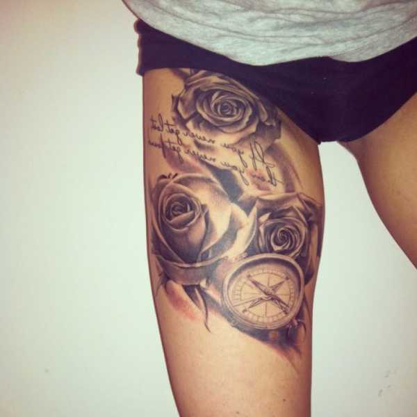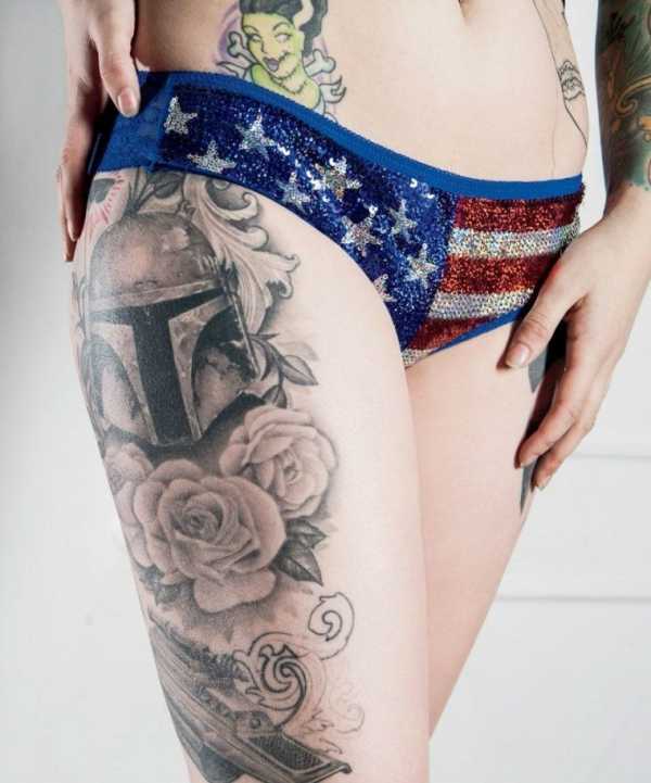 Есть множество мест на теле, где тату будет смотреться очень красиво, аутентично, где оно будет притягивать взоры. Компромиссным вариантом является размещение его на бедре. Большая площадь позволяет реализовать смелые фантазии, создать комплексные узоры, завернуть рисунок так, как только хочется. В то же время, есть возможность, при возникновении подобного желания, оперативно замаскировать изображение, надев, например, штаны — и вот, имидж вновь стал более чем приличным и нейтральным. Универсальное и притягательное решение. Что ещё нужно? Тем более что фото, представленные в галерее, позволяют лишний раз убедиться в том, что подобное место размещения тату может быть более чем привлекательным.Вариации
