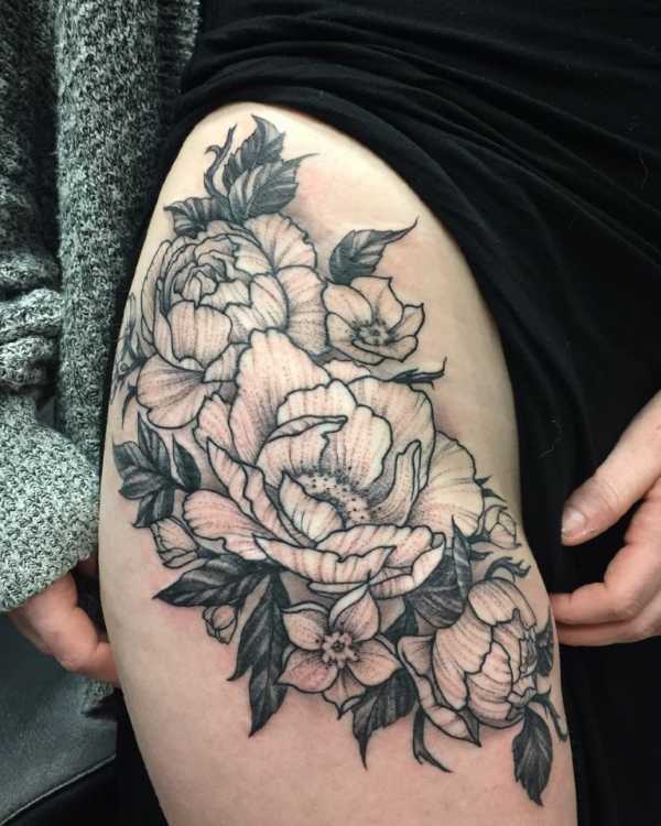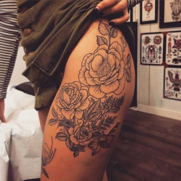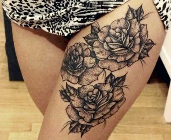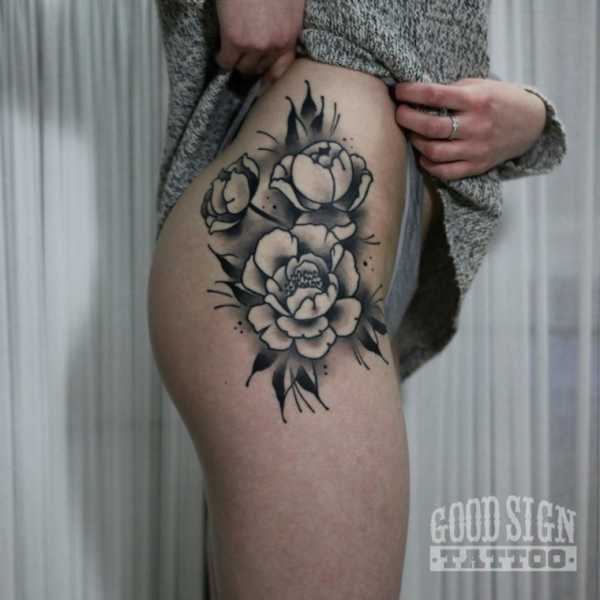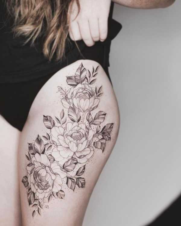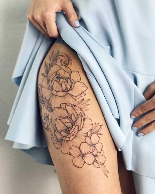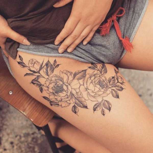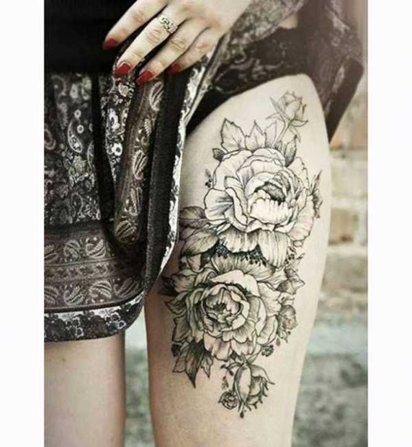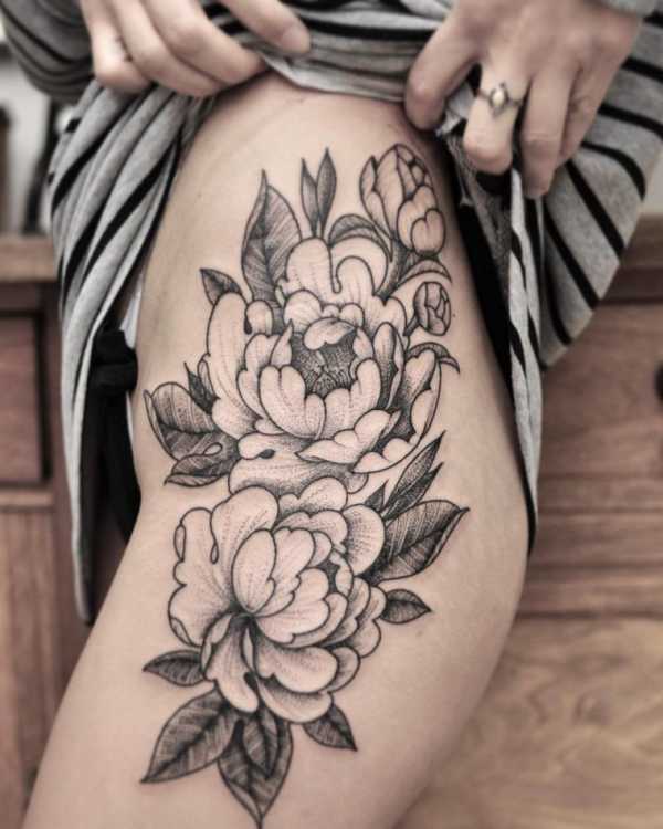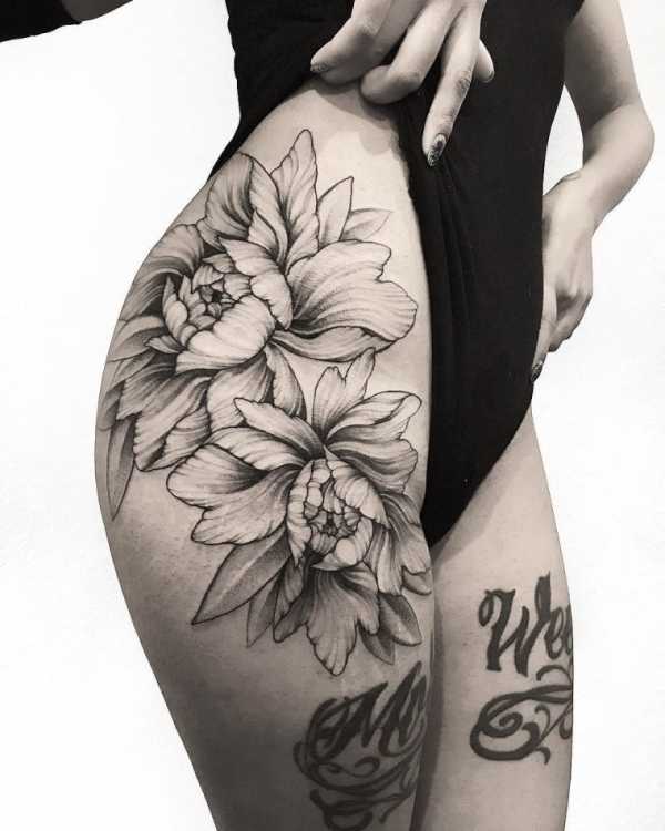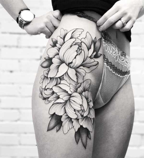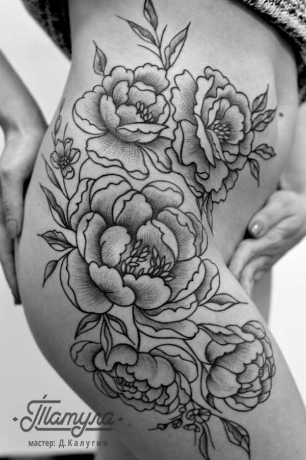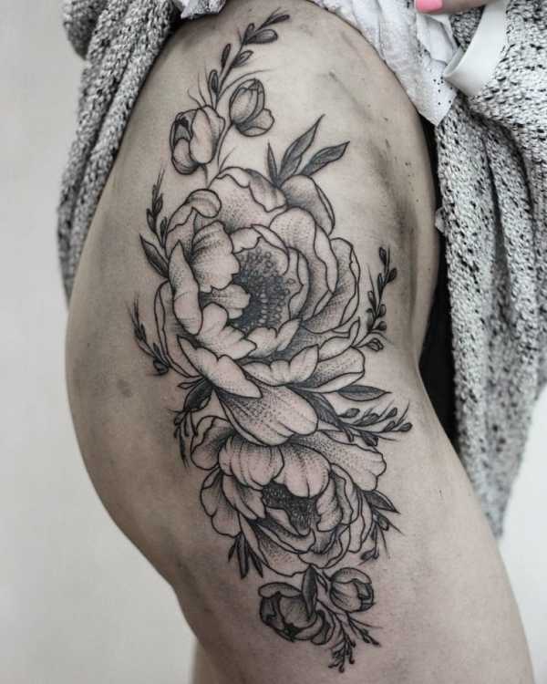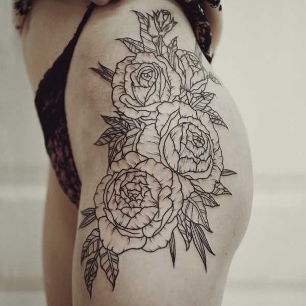 Самыми популярными и любимыми многими девушками цветами являются розы и пионы, обозначающие любовь, красоту и нежность. В основном, женские тату на бедро наносятся в стиле минимализм, дотворк и акварель.