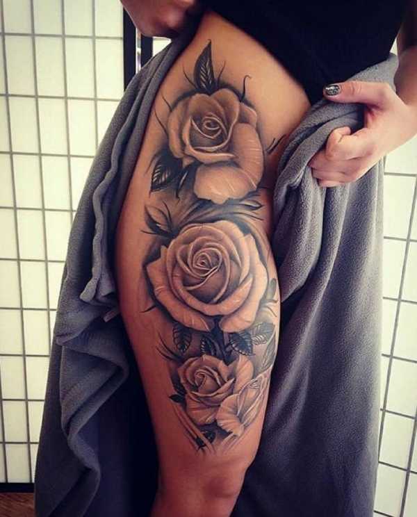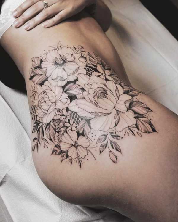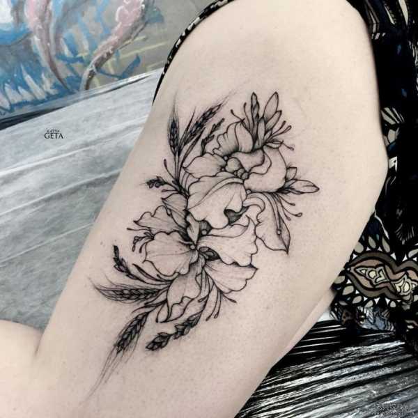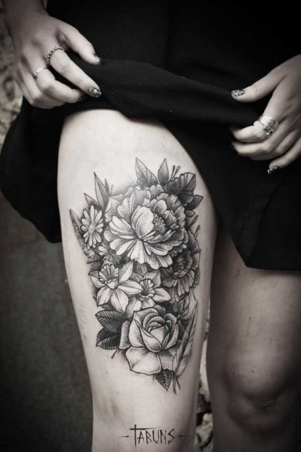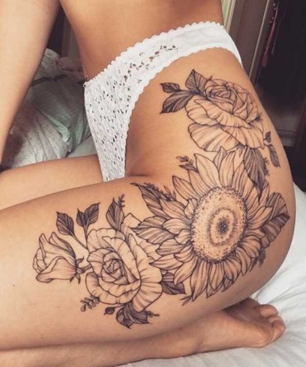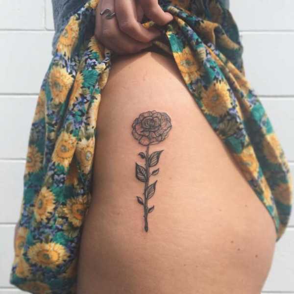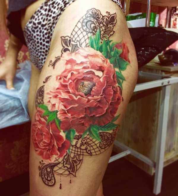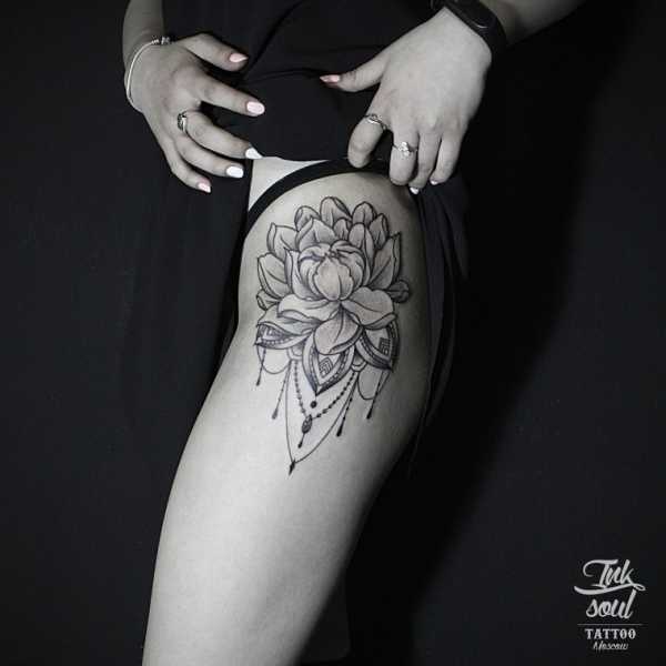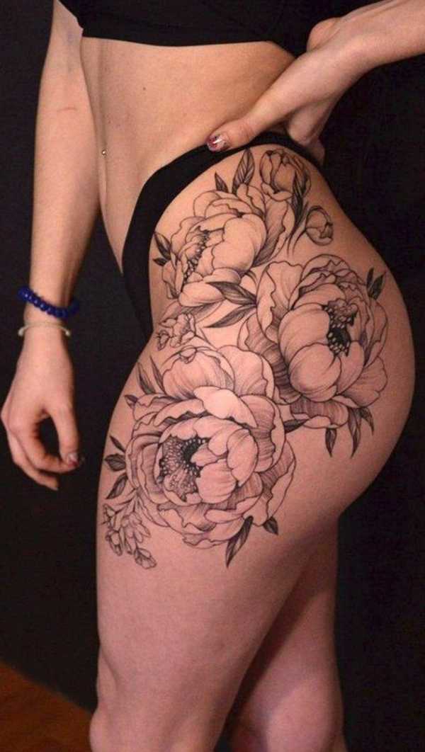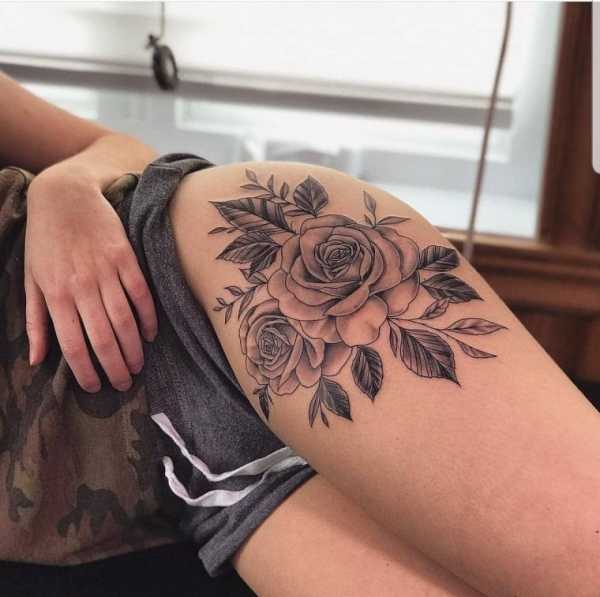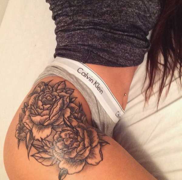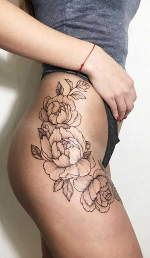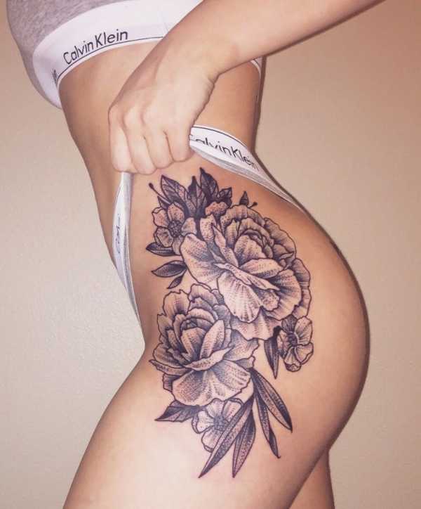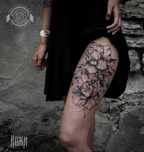 Самыми популярными и любимыми многими девушками цветами являются розы и пионы, обозначающие любовь, красоту и нежность. В основном, женские тату на бедро наносятся в стиле минимализм, дотворк и акварель.
