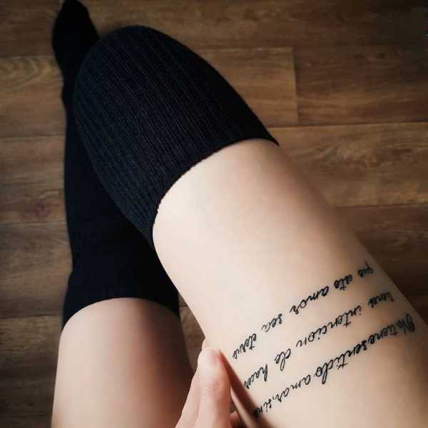 Бедра – это идеальный холст для нанесения различных татуировок. На этой области можно набить как небольшое, так и довольно крупное тату, простирающееся вверх до ребер или вниз до икр, в зависимости от дизайна и предпочтений носителя рисунка. Ниже рассмотрим удачные варианты расположения татуировок на ляжке у девушек.