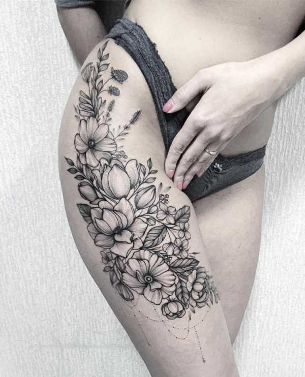 Татуировки на бедре могут с легкостью сделать девушку более сексуальной, привлекательной и соблазнительной в глазах противоположного пола. Все дело в том, что на этой части тела эффектно смотрится любой эскиз, будь то цветы, узоры или изображение любимого животного. В статье рассмотрим самые популярные тату на бедре у девушек и разберем их значение.