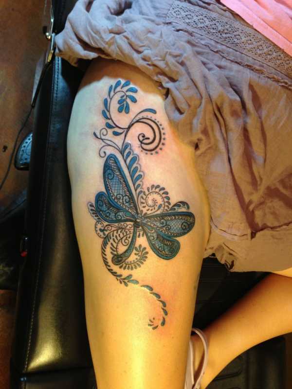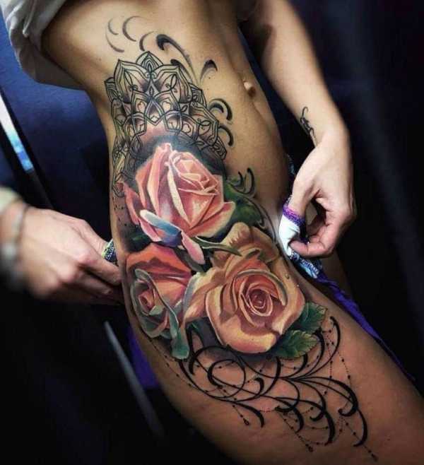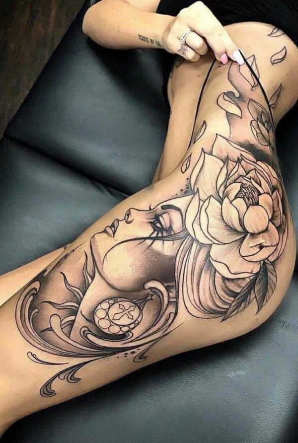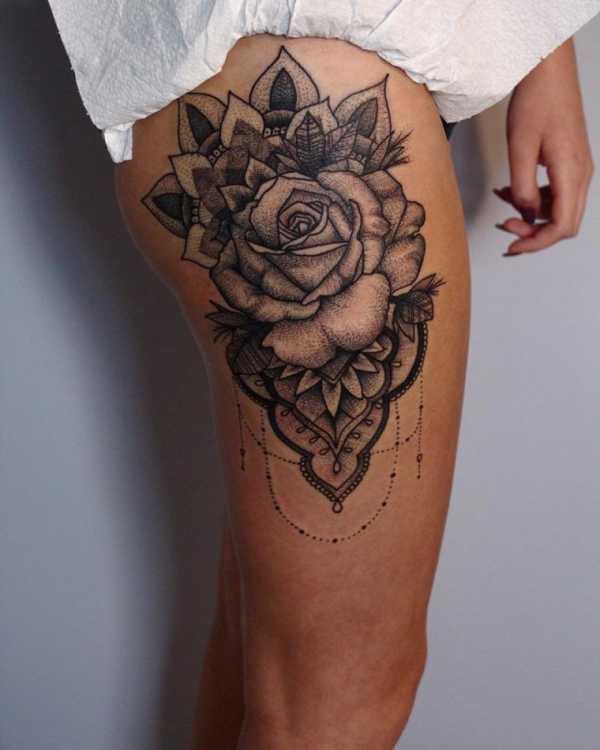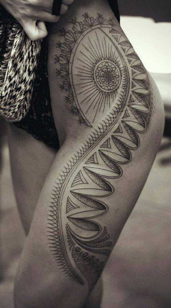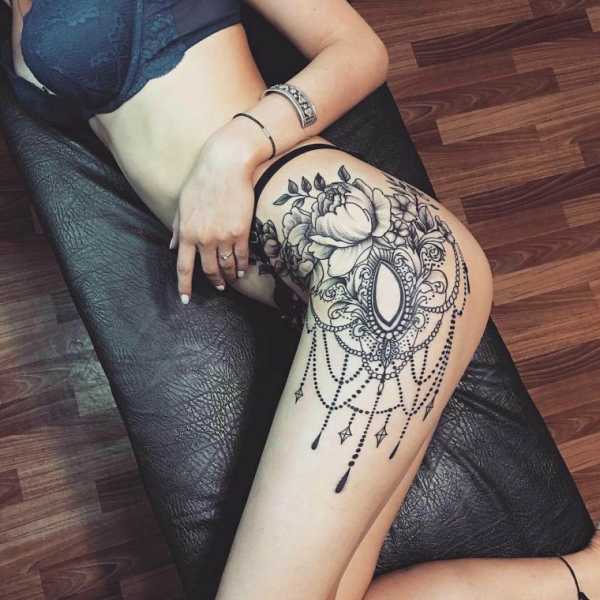 Чаще всего, узор на бедре представляет собой мандалу, цветы, кружева или племенные символы, нанесенные на боку.