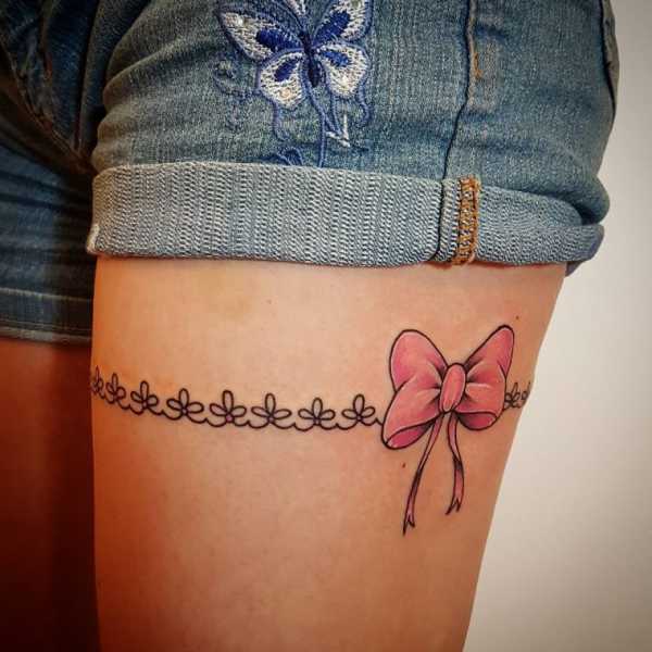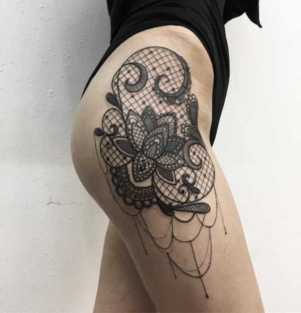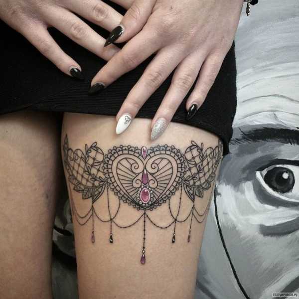 Кружевные тату на ляшках предпочитают наносить девушки, любящие внимание со стороны мужского пола. Подвязки, безусловно, очаруют любого мужчину, вне зависимости от его изначального отношения к татуировкам.