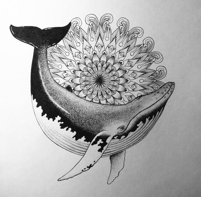 Индуистская татуировка с доминированием кита выглядит очень вызывающе, мистически и соблазнительно.