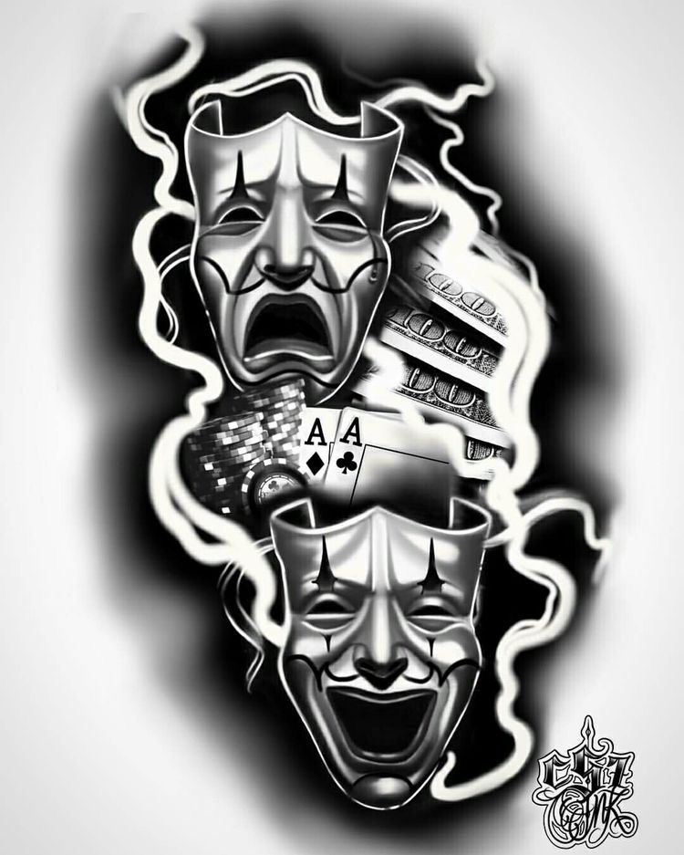 Очень брутально и мужественно смотрятся чикаго на мужском теле. Эскизы с оружием подойдут для мужчины, стремящегося продемонстрировать свою силу и умение постоять за себя. Рисунок женщины с повязкой на рту подойдет для молчаливой и скрытной личности.