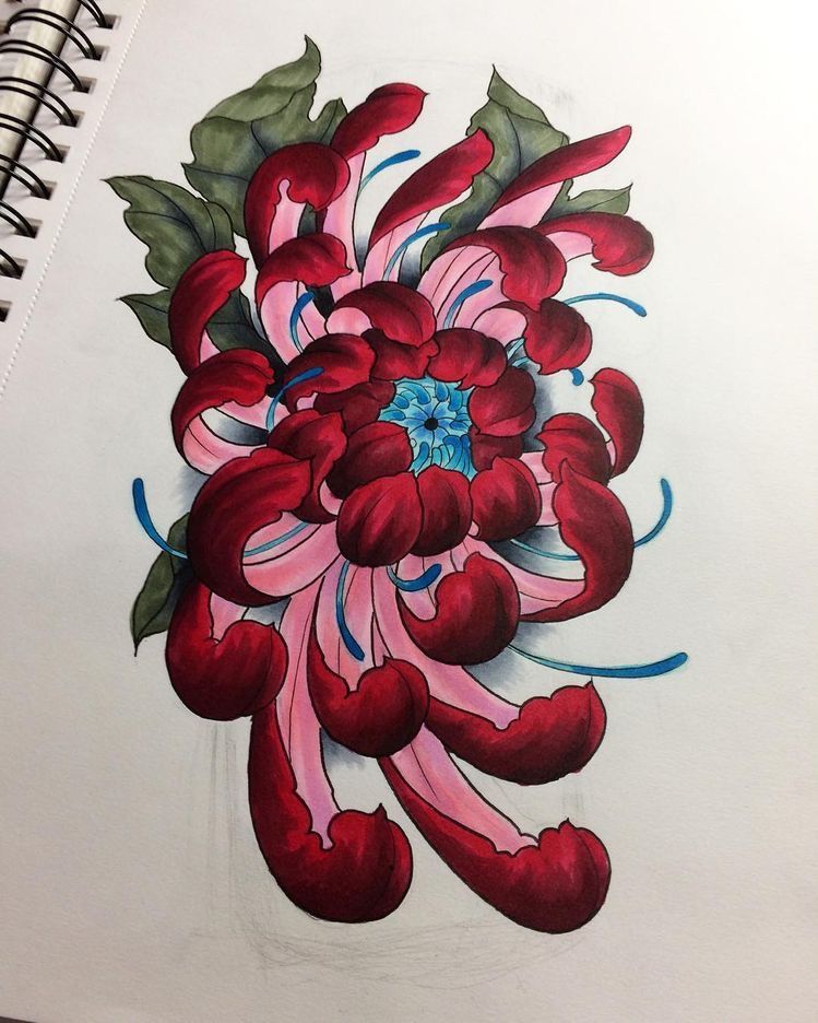 - Девушки, как правило, выбирают яркий эскиз для своей татуировки. Хризантема выполняется в сочных красных или розовых тонах. Темно-зеленые листья, в которые заключены цветы хризантемы, хорошо оттеняют цвет ее лепестков. Сердцевина цветка, в таком варианте оформления татуировки, обычно бывает желтой.