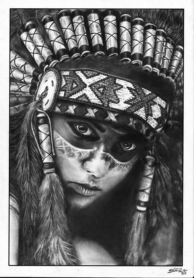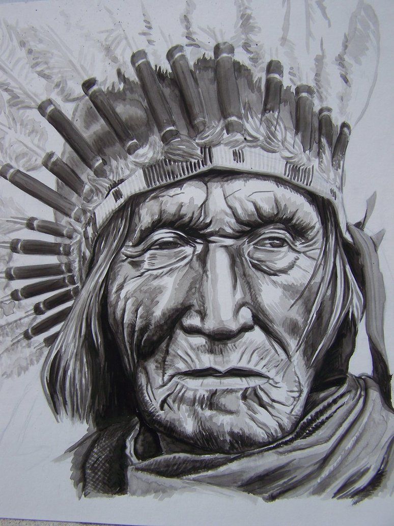 Важная особенность – индейцев принято изображать в головных уборах, сооруженных из перьев птиц. Лицо индейца должно быть ярким и красочным, в полосах и узорах. Что касается стиля, то лучше всего выглядит портрет индейца в стиле реализма, ведь только эта техника исполнения передаст всю яркость и красочность его образа.