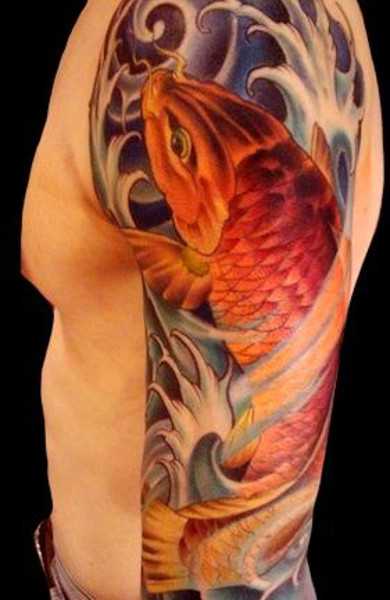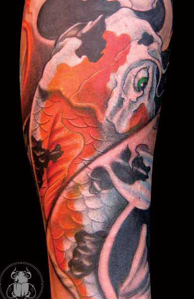 Тату японский карп считается популярным и интересным дизайном не только из-за своей красочной окраски, но и из-за глубокого символизма, вкладываемого в эту рыбу уже много веков китайской и японской культурой. Японских карпов на родине чаще всего называют Кои. Этих рыб специально выводили, добиваясь насыщенной и яркой окраски.