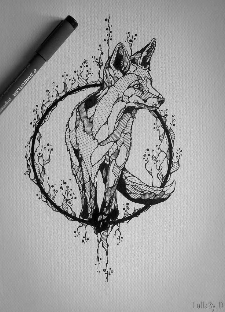 Для этого рисунка вам понадобится обычный лист бумаги и черный маркер. Начните с рисования головы лисы. Сделайте уши с кисточками внутри и добавьте черты лица. Нарисуйте пушистый контур тела и длинного хвоста. Заполните цвета по своему вкусу, и он будет готов.