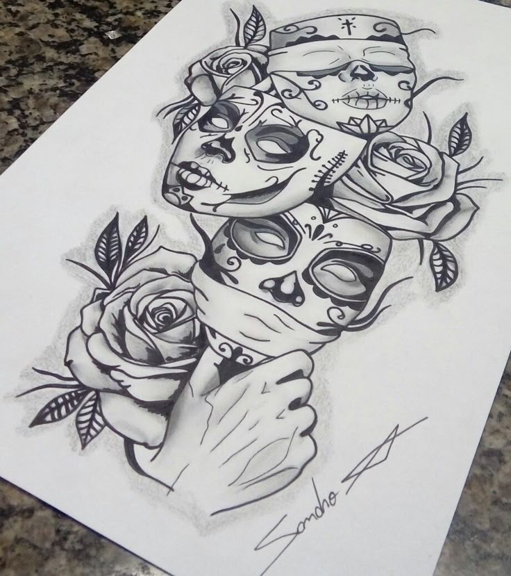 Татуировка череп и ноты с розами выполнены профессиональным тату-мастером