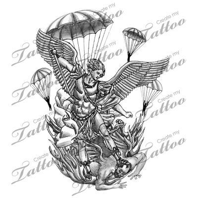 Популярные рисунки для этого типа татуировки изображают святого, вонзающего свой меч в сердце сатаны. Часто дизайн также показывает низкие крылья, которые могут появиться сзади, где на самом деле должны быть крылья. С доспехами, обернутыми вокруг него, это показывает образ защиты от зла всех типов.