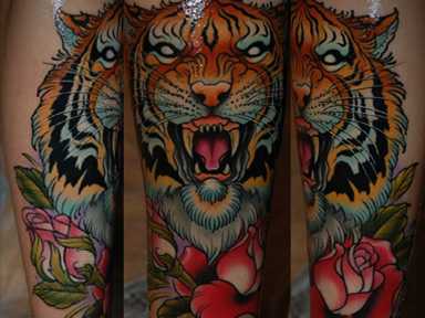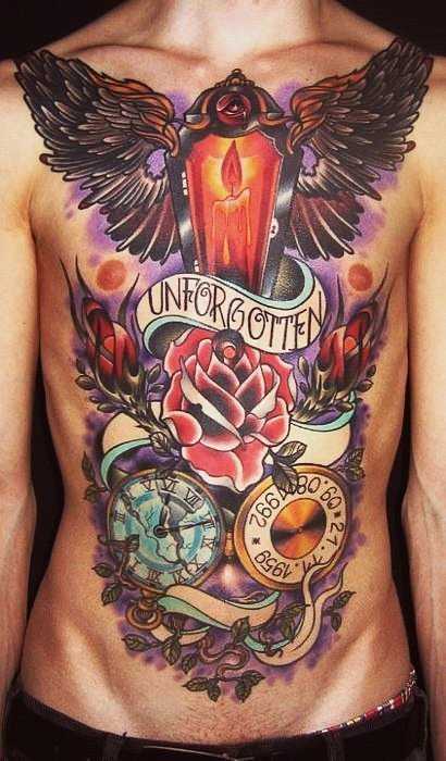 Женские лица, птицы, часы с циферблатом, черепа, кресты, огонь, кинжалы, ангелы и цветы, преимущественно розы, — частые персонажи татуировок в стиле New School. Но напомним, что у мастера здесь полная свобода действий. Он может находить своих героев в рамках одного из подвидов.