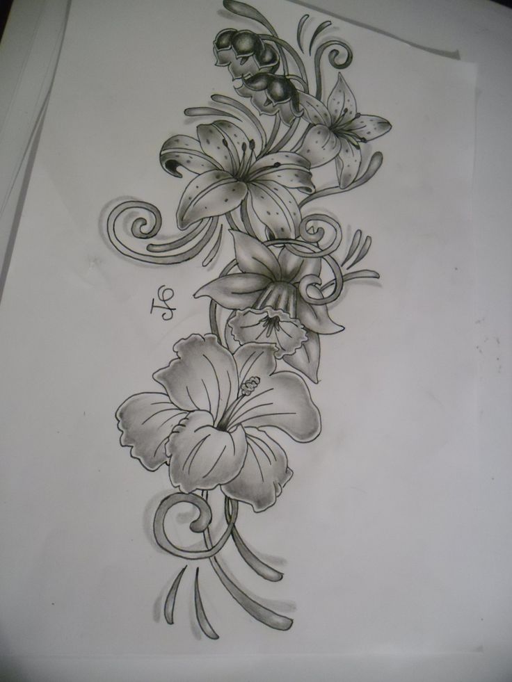 Милая татуировка в виде лилии и орхидеи, балансирующей на одном стебле.