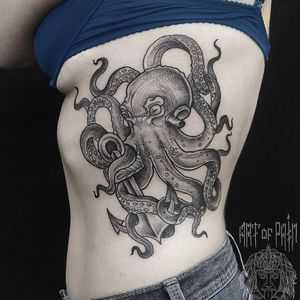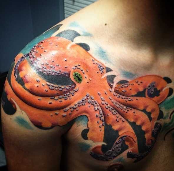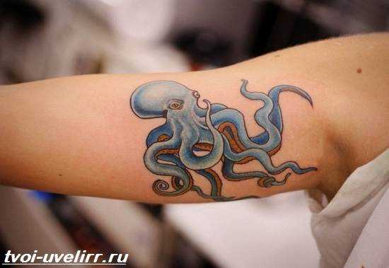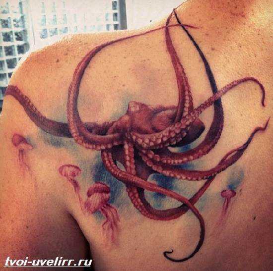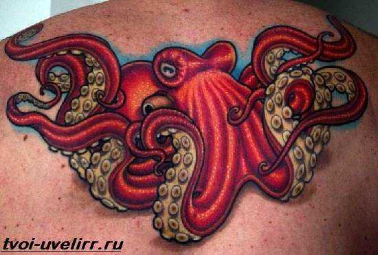 Все времена осьминог поражает людей своей загадочностью. Со столь мистическим обывателем морской пучины существует немалое количество преданий. Различные народы одновременно восхищались осьминогом и входили в ужас при его виде. Тату осьминог не столь популярна, но все же имеет немалое количество поклонников. Наиболее эффектно осьминог смотрится на масштабных поверхностях тела: спине, груди, на боку или плече.