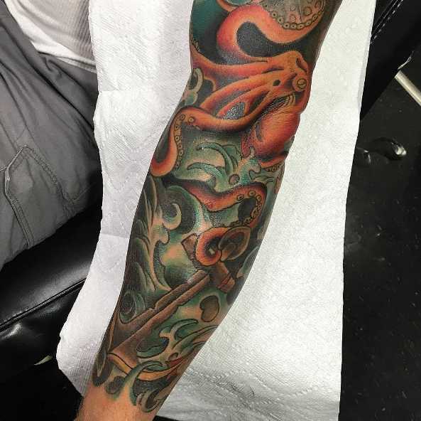 Цветные татуировки с осьминогами, в большинстве, представляют внешний вид моллюска, прорисованный в технике реализма.