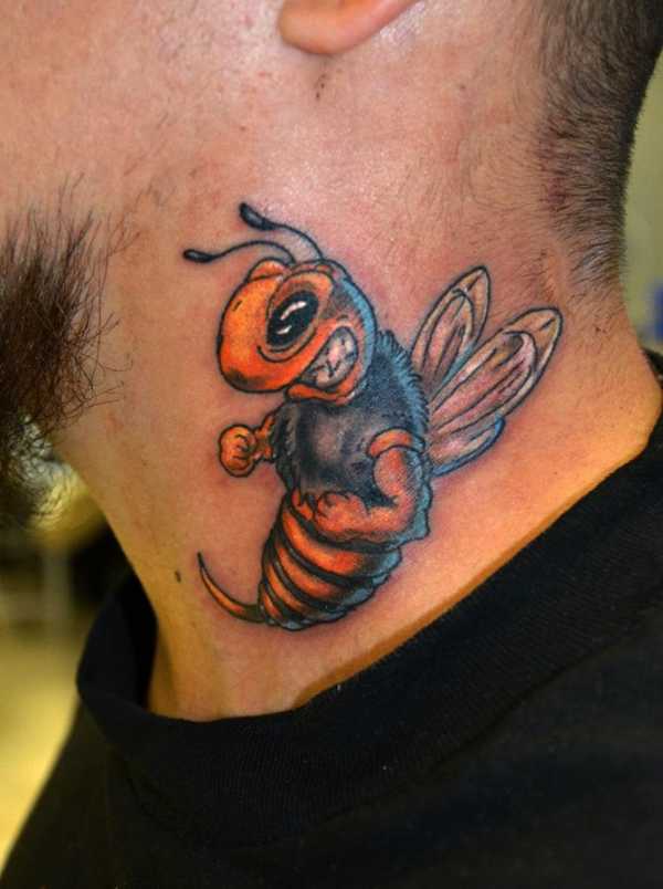 Эскиз татуировки пчела отлично смотрится в цветном исполнении, как правило, он включает в себя еще соты и мед, но не обязательно. Наносят изображение на любую часть тела: шею, запястье, спину, грудь и т. д.