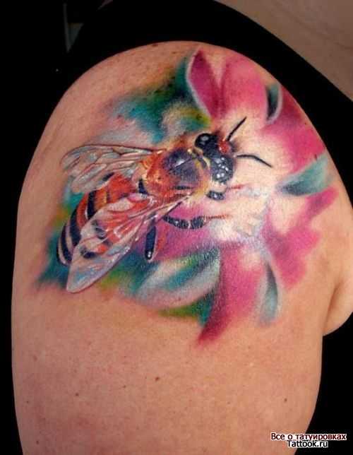 Иногда тату в виде пчелы выбирают представители обеих полов не по причине особой символики, а из-за красивого изображения. Очень часто выбором становятся нательные рисунки в технике олдскул. Не менее интересным вариантом могут быть и тату в стиле акварель.