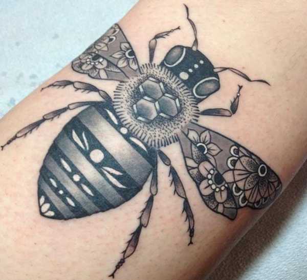 Эффектное нательное изображение пчелы может рассказать про мудрость своего обладателя.