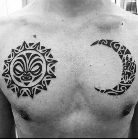 У мужчин же такое тату трактуется совсем по другому. Например раньше, в некоторых племенах, солнце обозначало добро, а луна зло. Несмотря на такое противоречие, совместный рисунок для мужчины является символом, приносящим удачу, любовь, покровительство высших сил. Такая татуировка может символизировать начало добра и зла, дня и ночи. Тем самым показывая, что в человека есть как добро, так и зло.