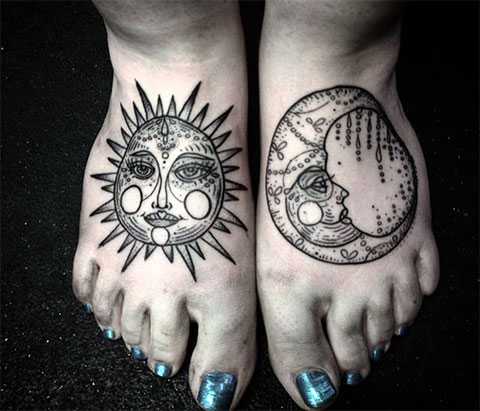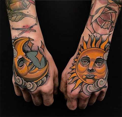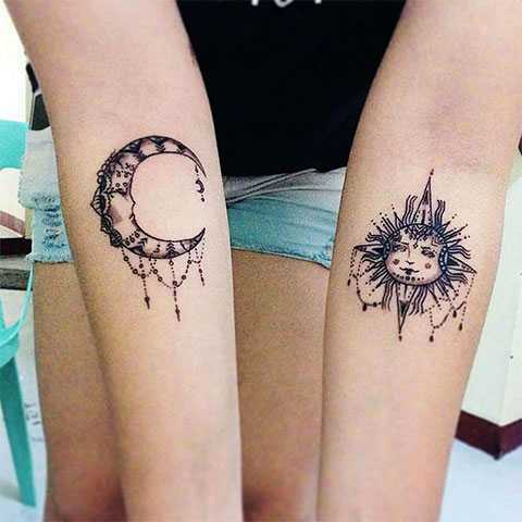 Тату с солнцем и луной давно приобрели свою популярность. Солнце считается символом вечной жизни и несет положительную энергетику. В свою очередь луна — символ загадочности и умиротворения. Луне поклонялись, считали ее могущественнее солнца, которое луна может затмить. Сразу два небесных тела, выполненные в одном эскизе для тату соединяют собой две противоположности — символ гармонии женского и мужского начала, знак бесконечности мироздания. Поэтому татуировка с изображением Солнца и Луны подходит как мужчинам, так и женщинам.
