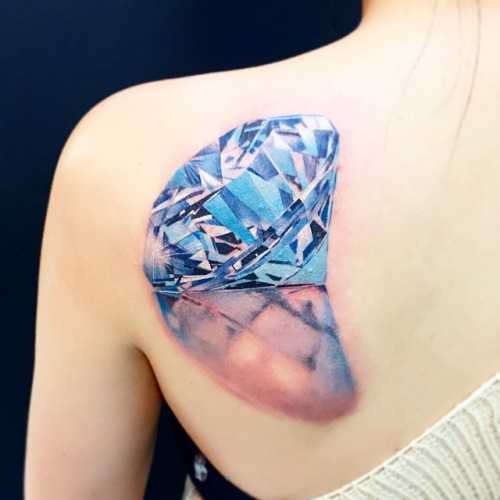 Бриллиант отлично смотрится как сам по себе, так и в сочетании с другими атрибутами: крылья, цветы, бабочки или листья. Выбор цвета для тату ограничен только вашей фантазией, но чаще всего применяется или черно-белые и цветные: голубой, лиловый, нежно розовый камень. При вашем желании, опытный мастер сможет передать блеск камня.