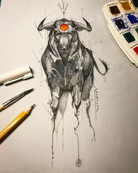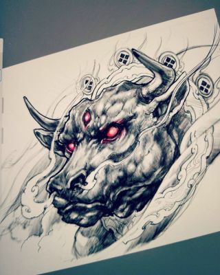 Тату эскиз быка обозначает мужское начало, силу, мощь, плодовитость, и исходя из этого, можно смело предположить что больше данная татуировка подходит представителям мужского пола. Черный бык с огненным взглядом может обозначать смертельную игру.
