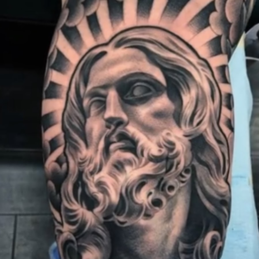 Эта татуировка с Иисусом довольно крутая со священным сердцем прямо под его портретом. Это придает ему божественный вид.