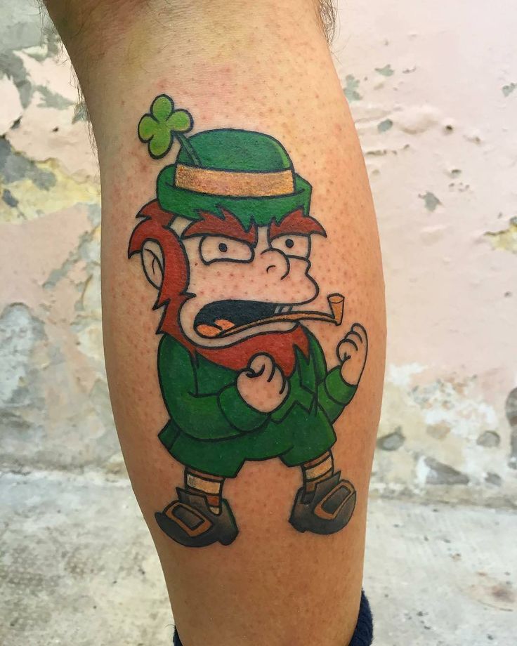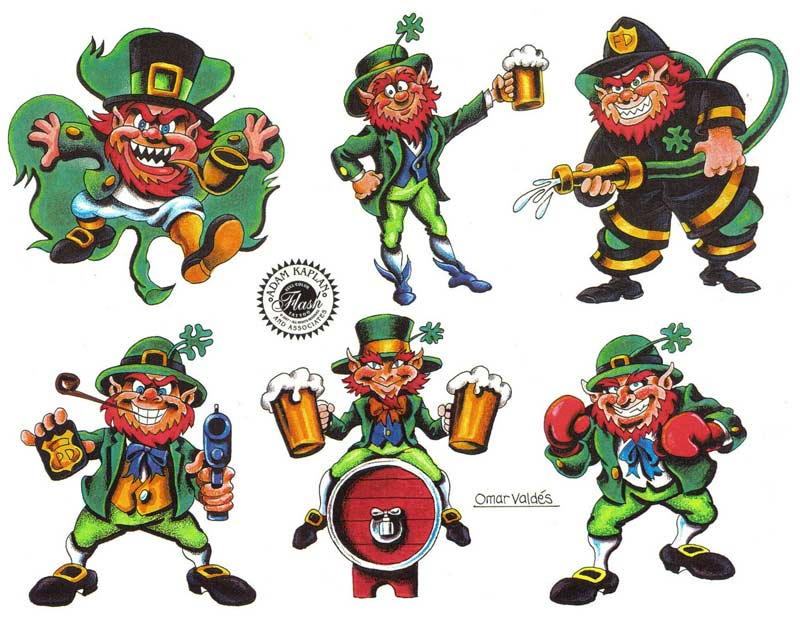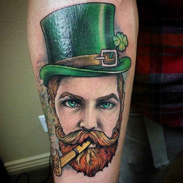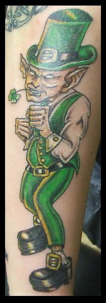 Лепрекон с рыжими волосами, шляпой с покрытием, зеленым пальто и трубкой является символом людей ирландского происхождения. Люди ирландского происхождения обычно предпочитают оригинальное изображение существа, используемого в татуировке.