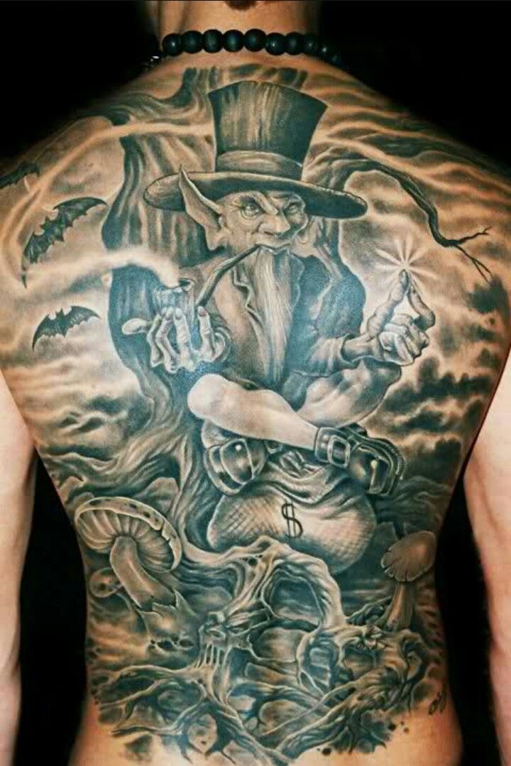 SG Татуировки: 7) Злобно выглядящая татуировка Лепрекона: Человеческое лицо на его лице достаточно, чтобы представить его дьявольскую сторону. Вы определенно хотите избежать попадания на неправильную сторону этого. Облака выше его уносят с собой волнообразный результат, который только усиливает образы. То, как он был нарисован на спине, заставляет его руки появляться каждый бит, хотя он манит вас в свои планы. Он, по всей вероятности, уговаривает вас устроить свои шалости.