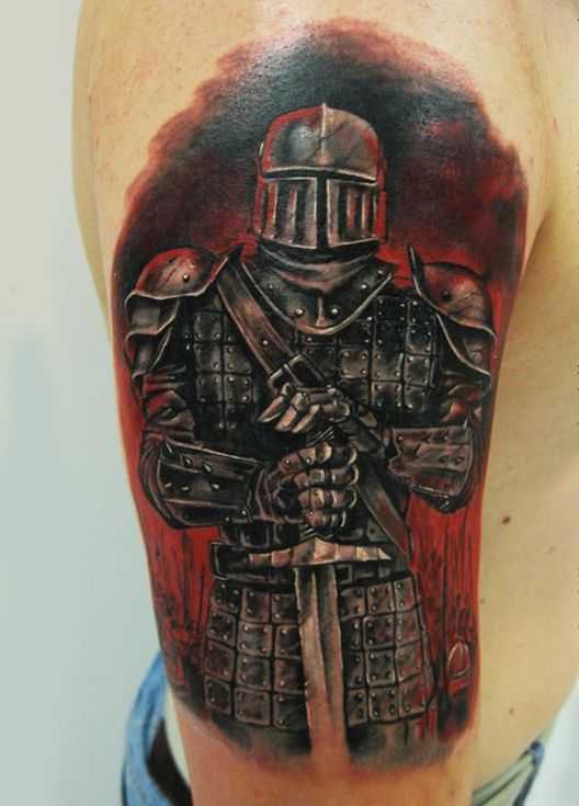 - Эскиз рыцаря в доспехах, держащего в руках меч говорит о силе и доблести. Ног, есть еще одно обозначение. Часто такую татуировку человек делает дабы защитить себя от ударов с внешнего мира. Тату наделяет человека храбростью, силой, уверенностью.