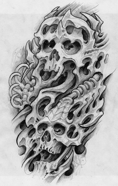 Одной из излюбленных техник мастеров является использование рисунков по кости. Обычно в татуировках они проступают сквозь разорванную плоть. Эффект достигается за счет прорисовки частей тела, пораженных травмой.