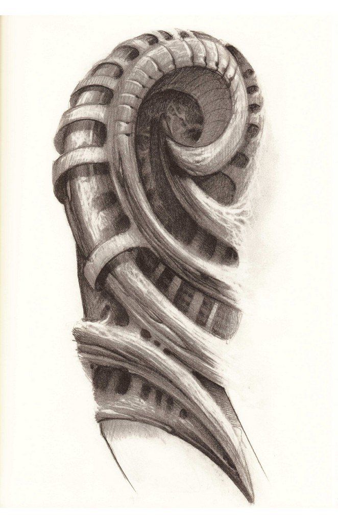 эскизов татуировок в стиле биоорганика на руке, плече, шее и предплечье.