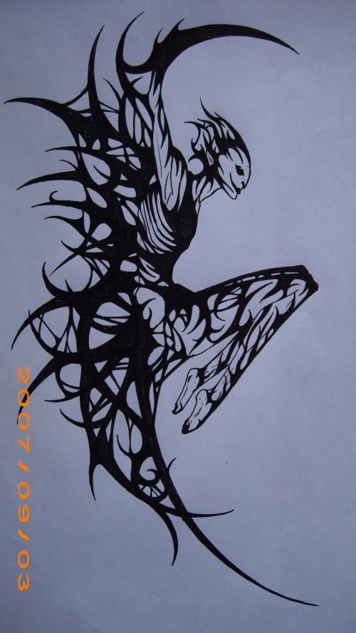 Работа выполняется насыщенным черным цветом, окрашивая, в основном, значительные участки тела. За основу этого стиля были взяты ритуальные татуировки буддистов, так как они тоже выполнялись в черных цветах. Это направление полностью исключает другие оттенки, которые возможны в этом искусстве, раскрывая перед нами всю загадочность и мистику тьмы.