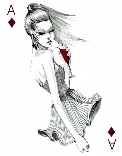 Эскизы игральных карт, на которых изображены девушки различных мастей.